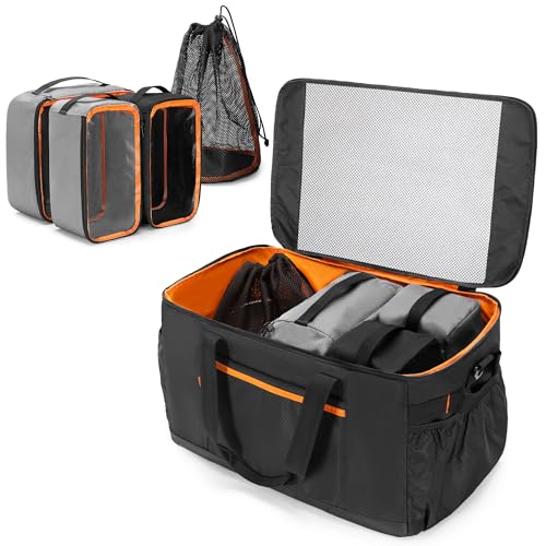 Camping Organizer Box Kit: 2 color packing cubes in total 3 pcs + 1 mesh pocket, which can be placed in the attached extra large storage bag, and hold all your camping equipment or kitchen necessities
