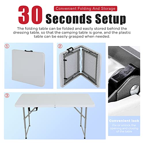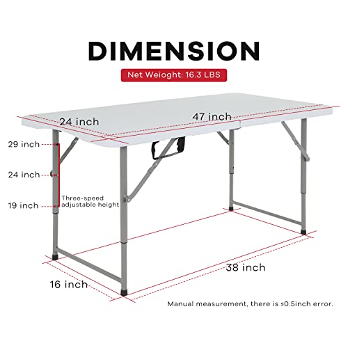 Folding Table 4FT, Plastic Table Height Adjustable Table for Picnic, Camping, Kitchen, Beach, Party, Outdoor Indoor, 47 x 24 x 29 Inch,White