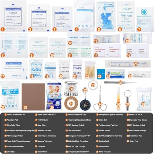 ULTIMATE PEACE OF MIND: Fully packed with 330 professional medical supplies – all kinds of bandages, povidonc-lodine prep pad, gloves, Instant ice pack, tourniquet, etc. Meets international medical standards, 100% latex free