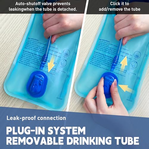 Leak-proof Design, Good Sealing: The water bladder for hiking backpack adopts double sealing technology, which has passed the pneumatic pressure test, is pressure-resistant and ensures that the water bag is 100% leak-proof. The base connector uses a plug-in system, and the quick release and automatic shut-off valve prevents leakage after the tube is removed, and allows the tube to be easily disconnected from the water reservoir for filling, cleaning and storage