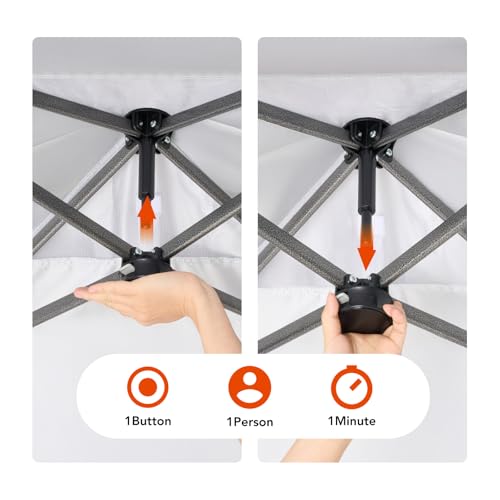 𝗢𝗻𝗲 𝗕𝘂𝘁𝘁𝗼𝗻 𝗤𝘂𝗶𝗰𝗸 &𝗘𝗮𝘀𝘆 𝗦𝗲𝘁𝘂𝗽:AMADA 10×10 pop up canopy features patented one push center lock tech, just open the canopy, push the button, and adjust the height for instant shade in only a minute!This outdoor canopy for patio can be set up by one person without any tools. Three adjustable height settings with one central button and no-pinch height adjusters to allow easy setup and breakdown ensure convenience and safety.