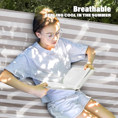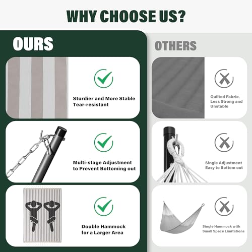 Versatile Use: Our portable double hammock is suitable for indoor and outdoor use. It can be hung on supports measuring 10-13 feet, allowing you to enjoy it with your family ones in any part of your home, such as your garden, patio, poolside, or balcony