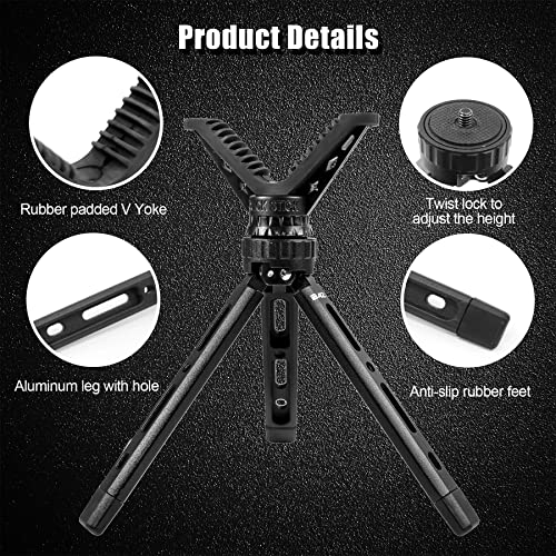 【Durable & Stable】The tripod comes with heavy duty aluminum construction to withstand rugged use and for durability in any shooting conditions. The V Yoke holder has molded heavy duty frame with soft rubber ridge built-in over the top, provides a good grip on the barrel or stock, yet will never scratch the barrel. The 3 legs are finished with non-marring rubber traction feet providing optimal stability regardless of the terrain, will not slid.