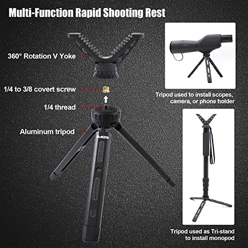 【Versatile and Easy to Use】User-friendly and unique design allows to install and use easily. The V yoke on the tripod holder is removeable, and is compatible with most mono / bi / tripod shooting sticks or camera sticks, you can easy install it on them. The tripod is compatible with telescope, binocular accessories, camera or rifle saddle; even can be used as a Tri-Stand to install camera monopod, allowing it to function as a Large Tripod.
