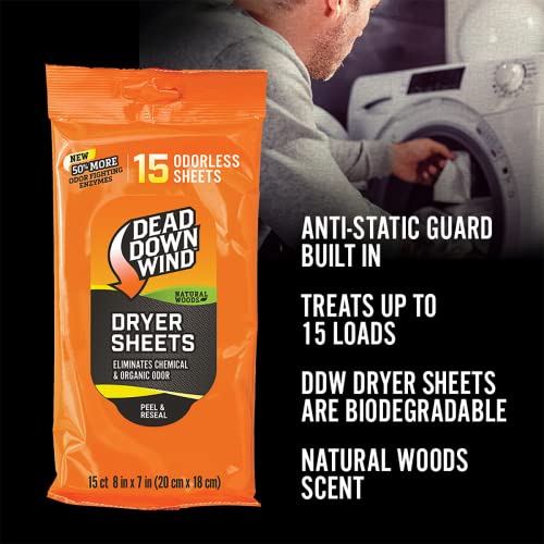 DEAD DOWN WIND Natural Woods Scented Odor Eliminating Dryer Sheets (15Ct) – Hunting Scent Control – Durable Hunting Scent Eliminators – Advanced Hunting Laundry Gear