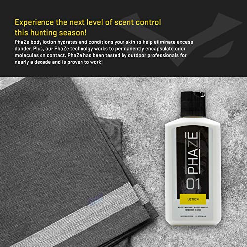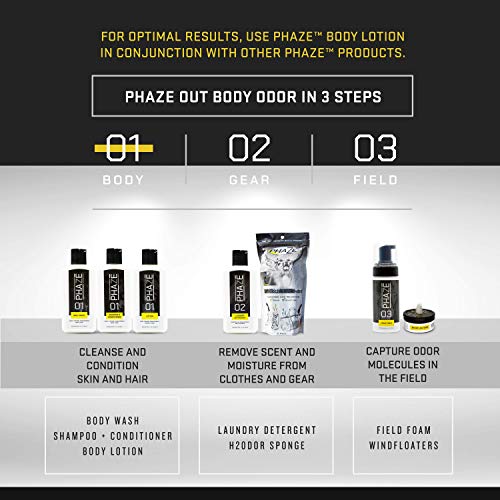 BODY CLEANSING SCENT CONTROL: PhaZe Scent Control Body Lotion works to bind and encapsulate your human body odor molecules, rendering those molecules undetectable to the animals you’re chasing; this unscented lotion for hunters works to condition your skin, minimize your dander, and eliminate odor. An essential addition to your hunting gear