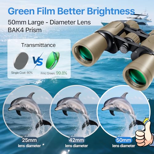 Professional Optics: The compact binoculars is adopted by BAK4 Porro Prism, it provides 99.8% light transmission and improves color reproduction. The green FMC anti-reflective coating reduces the reflected light in the objective lens and improves light transmission, image brightness, and image sharpness.