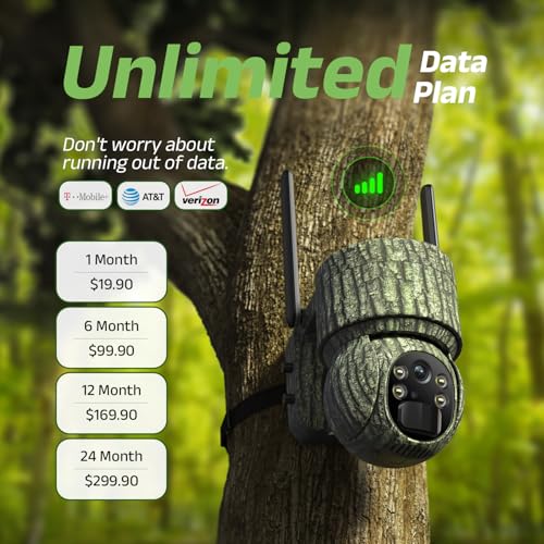 【Unlimited Data Plan】Each camera requires a separate data plan subscription, which cannot be shared. Prices are $19.9 per month or $169.0 per year (other data plans available). Built-in SIM card, Compatible with major US carriers like Verizon, T-Mobile, and AT&T, it’s perfect for remote areas such as woods, farms, and cabins. (Note: Non-removable built-in 4G SIM card.)
