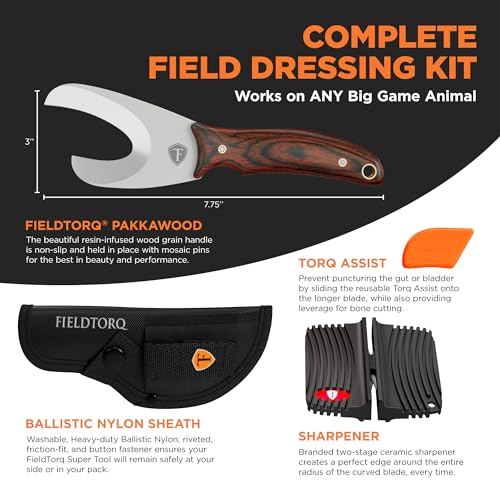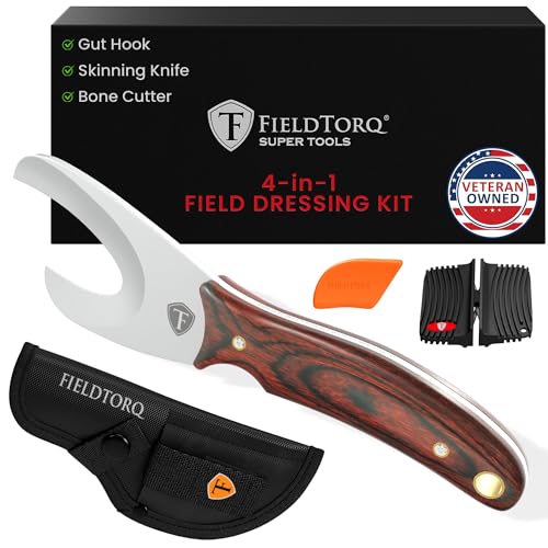 Field Dressing Kit | 4-in-1 Super Tool with Sheath & Sharpener | Skinning Knife for Hunting | Gut Hook | Deer Hunting Knife Set | Pakkawood