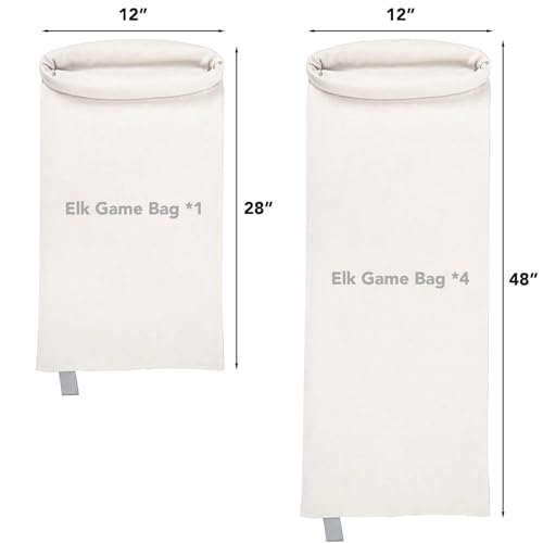 VERSATILE AND SPACIOUS – This set includes four 12×48-inch bags for large game bags and one 12×28-inch game bag for organs or smaller parts. With a stretch capacity of up to 21 inches, these bags accommodate various game sizes and types.