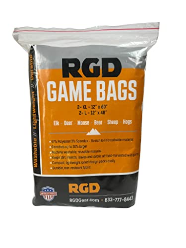 The RGD breathable game bags come in 4 packs of 2 – 12×60 inch bags and 2- 12×48 inch bags with sewn in labels signifying bag size. Bags are made of 97% polyester and 3% spandex offering significant stretch characteristics of up to 30%. Bags are machine washable and reusable. Game bags come pre-rolled for easy packing and application. Game bags are sized appropriately for deer, moose, elk, sheep, hogs, bears and other large game. Great packing out in Alaska, Colorado, New Mexico, Utah and Montana where carrying out quartered game.