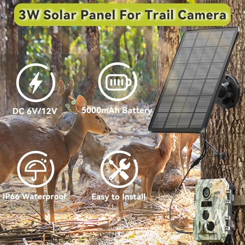𝐃𝐂𝟔𝐕 & 𝐃𝐂𝟏𝟐𝐕 𝐒𝐨𝐥𝐚𝐫 𝐏𝐚𝐧𝐞𝐥 𝐟𝐨𝐫 𝐭𝐫𝐚𝐢𝐥 𝐜𝐚𝐦𝐞𝐫𝐚𝐬: This 3W 6V/12V DC solar panel is designed for trail cameras, providing consistent solar-powered energy This solar panel allows any of your 6v/12v game cameras to run via solar even if they don’t have a battery! For best performance, fully charge the built-in battery via the included micro-USB cable before first use.