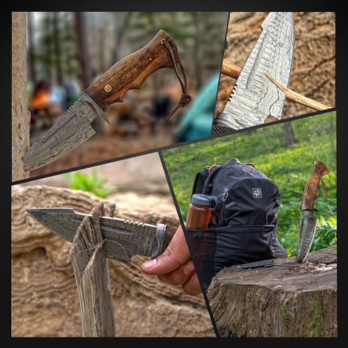10″ Handmade Damascus Hunting Knife with Sheath – Fixed Blade Hunting Knives for Men – Walnut Wood Handle Fixed Blade EDC Knife With Leather Sheath – Bushcraft Knives, Camping Knife Survival