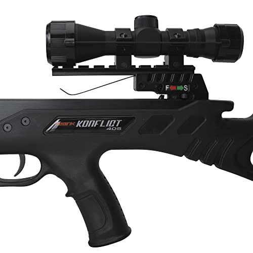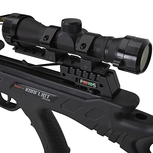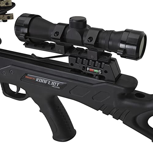 Meet the all-new field-ready Konflict 405 crossbow. This super-fast crossbow produces speeds of 405 FPS and high-performance at an incredible value. Offering aggressive lethal power with a draw weight of 185 lbs., the Konflict 405 delivers time and time again. The Konflict 405 is an incredible weapon for any hunter looking to spend more time in the woods with an adjustable fore end grip, ambidextrous safety, and rear adjustable stock. This crossbow also includes an anti-dry fire inhibitor, dual string suppressor system, and picatinny scope mount rail. Disrupting the price-to-performance ratio, this fully stocked crossbow comes complete with all the accessories needed including a 4×32 scope with multi cross-hair reticle with functioning eye piece, five arrow quiver, cocking rope, three arrow with field points, and rail lube/string wax.