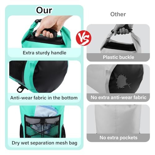 Functional Design: Dry backpack has an mesh pocket to separate wet and dry items, a reflective warning strip on the mesh pocket, and storage pockets on both sides, convenient and quick to use, comes with a top plastic handle